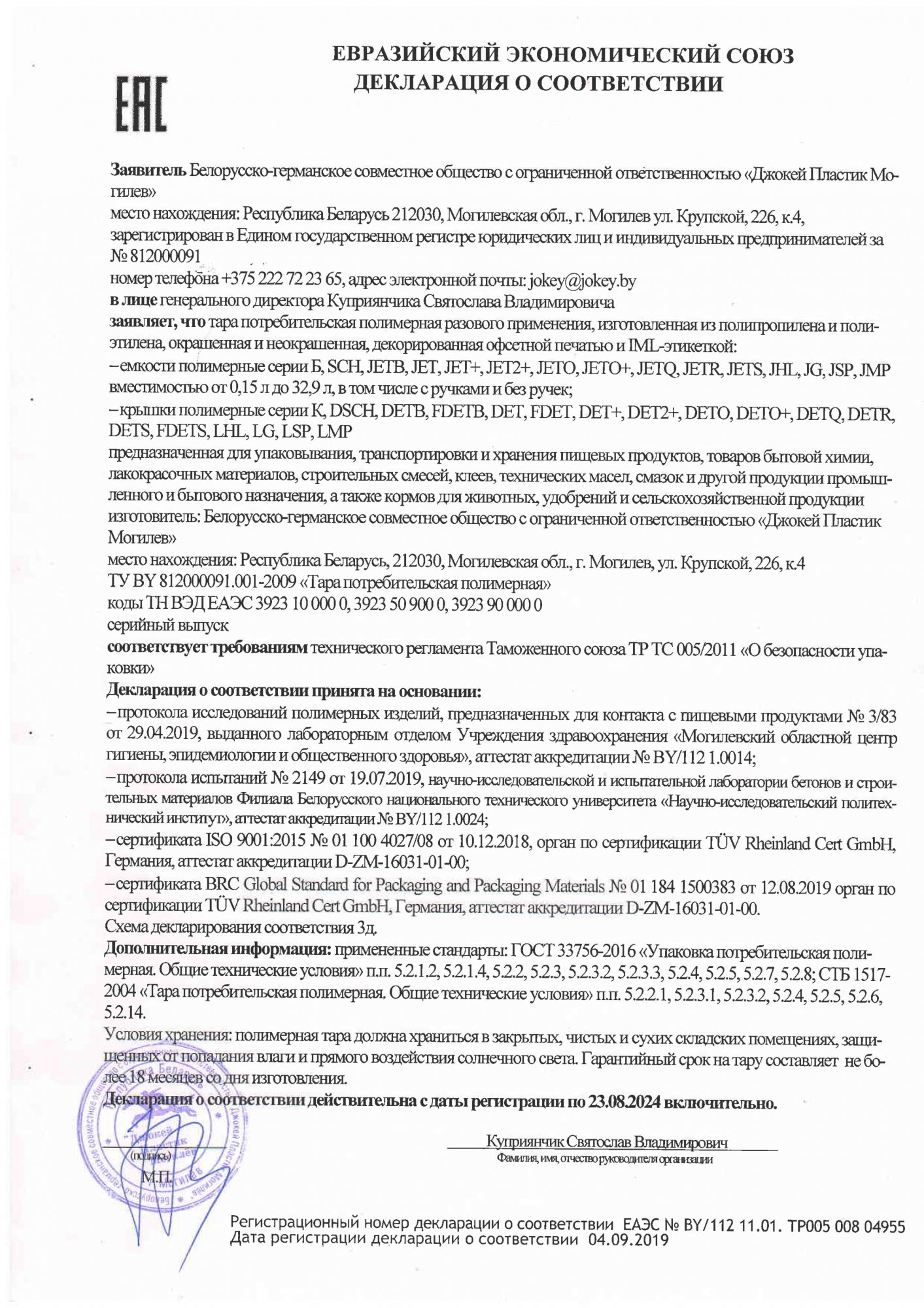 Декларация соответствия с Могилевского завода